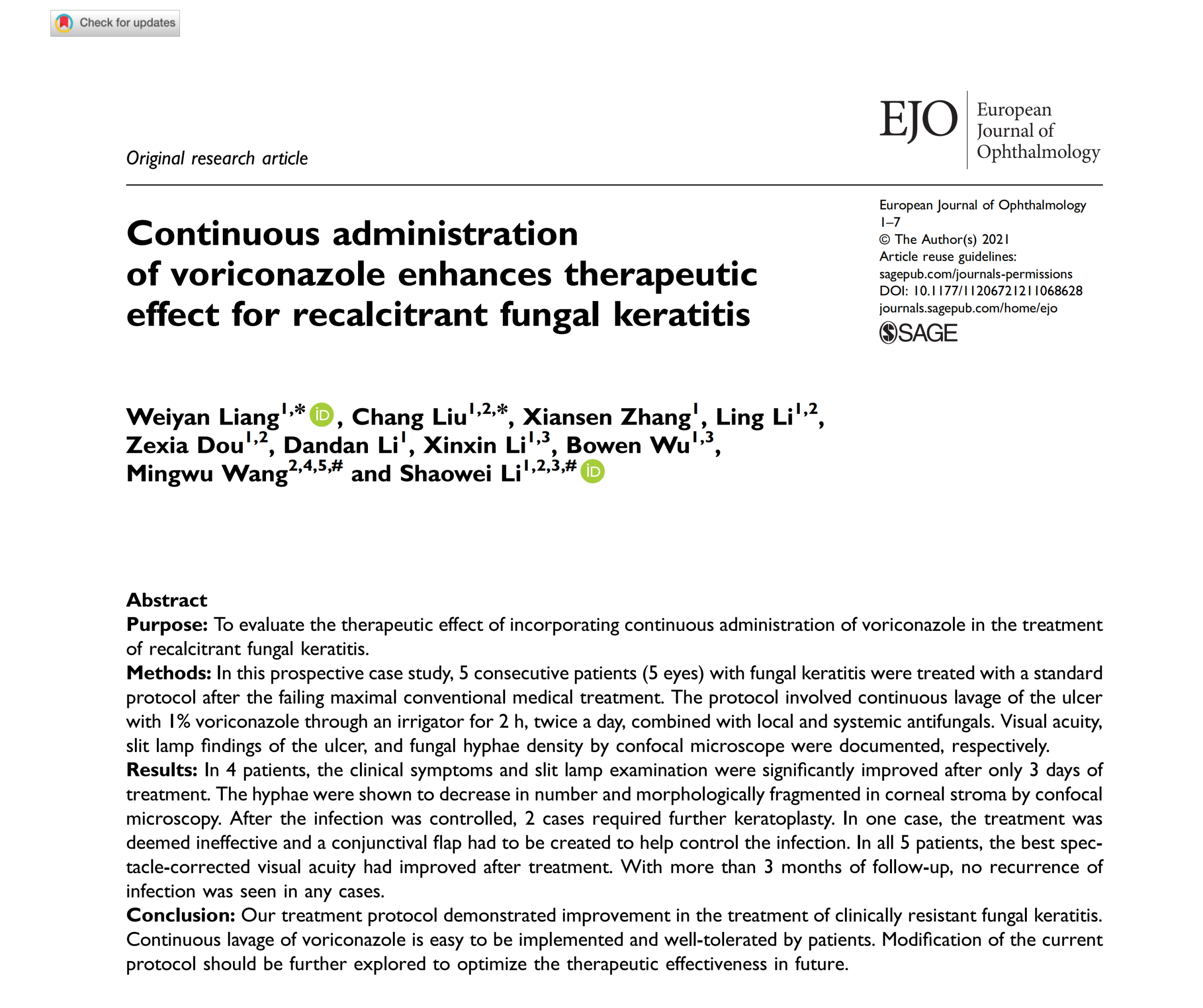 2026-03-04近日,爱尔眼科医院集团角膜病学组主任委员、爱尔眼科角膜研究所所长李绍伟教授所率团队的最新研究成果《Efficacy of 0.5% Voriconazole S...